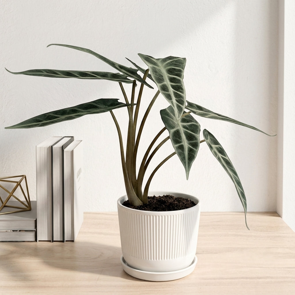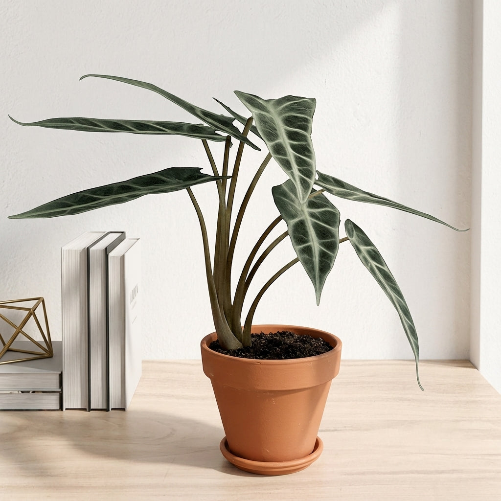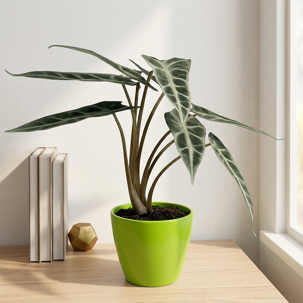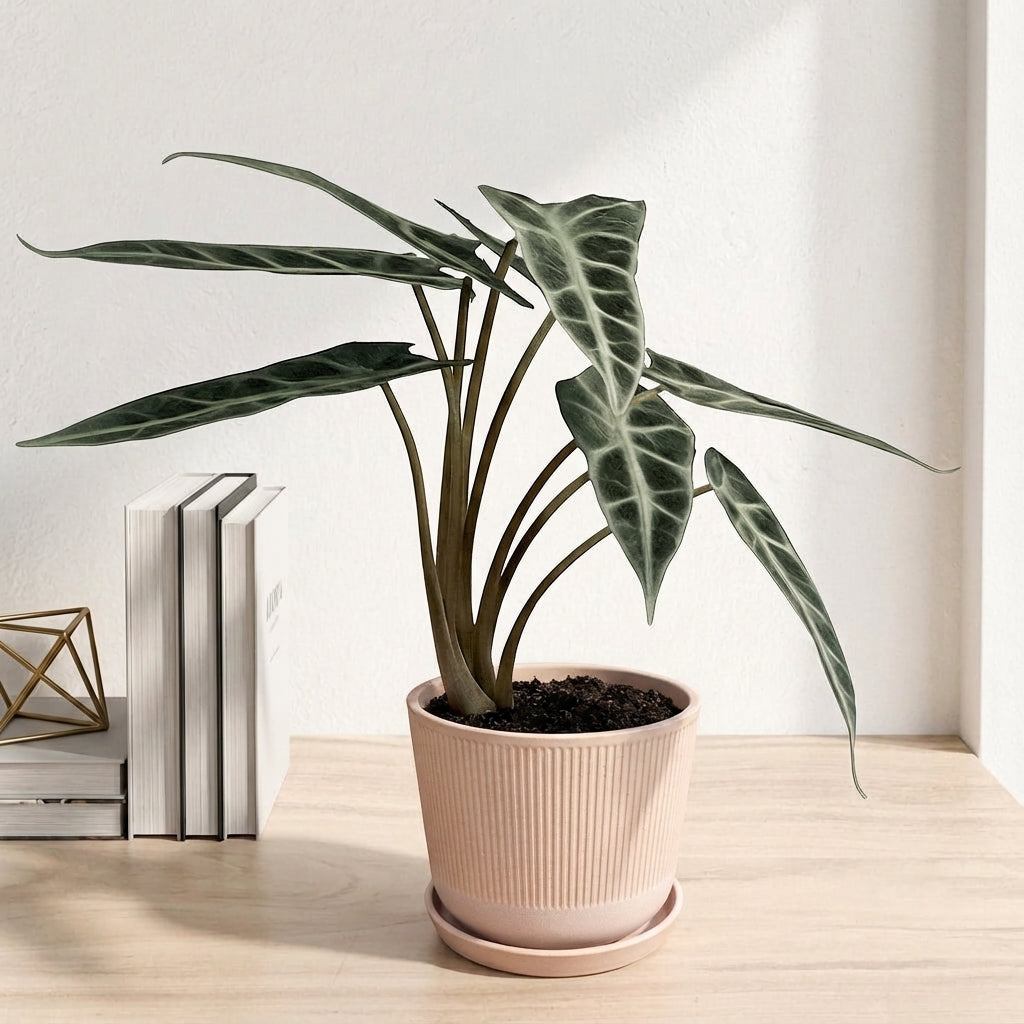האלוקסיה במבינו מציגה עלים דקורטיביים עם עיצוב דמוי רשת ייחודי בגוונים של ירוק כהה עם קווים בהירים בולטים, ומהווה צמח בית מהמם וקל לתחזוקה המוסיף אלגנטיות וסטייל מודרני לכל חלל פנימי.