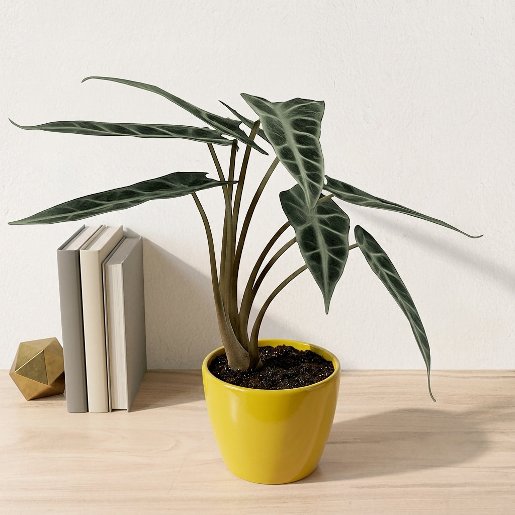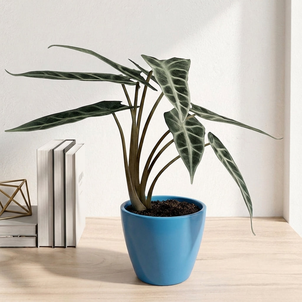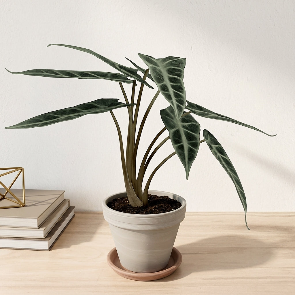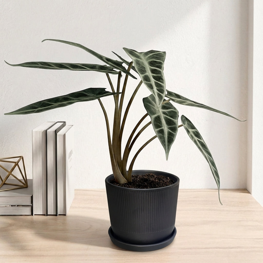 האלוקסיה במבינו מציגה עלים דקורטיביים עם עיצוב דמוי רשת ייחודי בגוונים של ירוק כהה עם קווים בהירים בולטים, ומהווה צמח בית מהמם וקל לתחזוקה המוסיף אלגנטיות וסטייל מודרני לכל חלל פנימי.