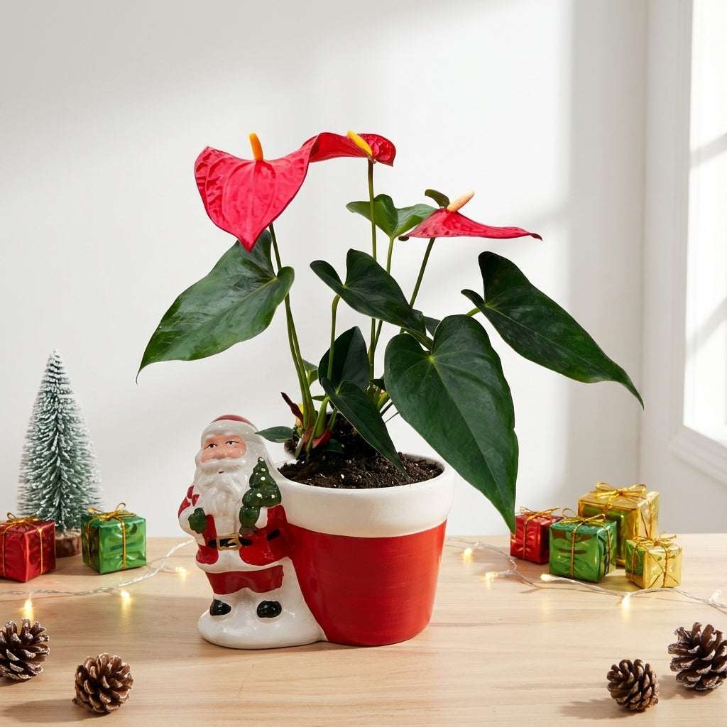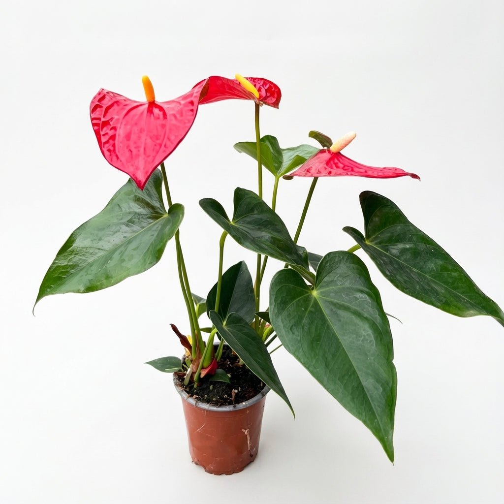 אנטוריום פורח הוא צמח טרופי מרהיב במיוחד בזכות הפרחים הייחודיים שלו - "פרחי לב" בצבעים עזים (אדום, ורוד, לבן או כתום) עם ספאדיקס (Spadix) בולט באמצע. מה שנראה כ"פרח" הוא למעשה עלה צבעוני המכונה ספאתה (Spathe), והפרחים הזעירים הם על הספאדיקס.