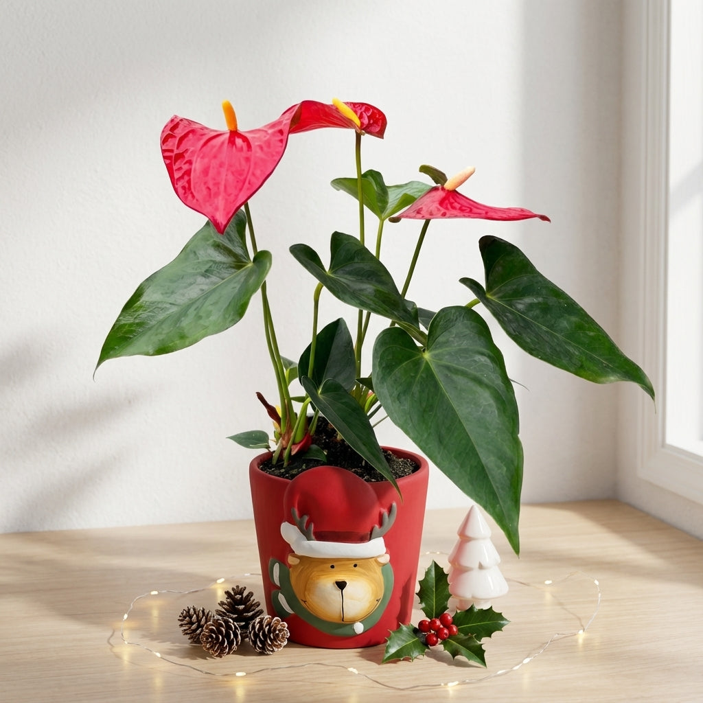 אנטוריום פורח קטן (Anthurium) הוא צמח נוי מרהיב בעל פרחים אדומים עזים בצורת לב עם spadix צהוב-כתום בולט. העלים הירוקים המבריקים בצורת לב יוצרים נוף טרופי אלגנטי המעניק חיים ולובש כל חלל בבית בצבע ובחום.