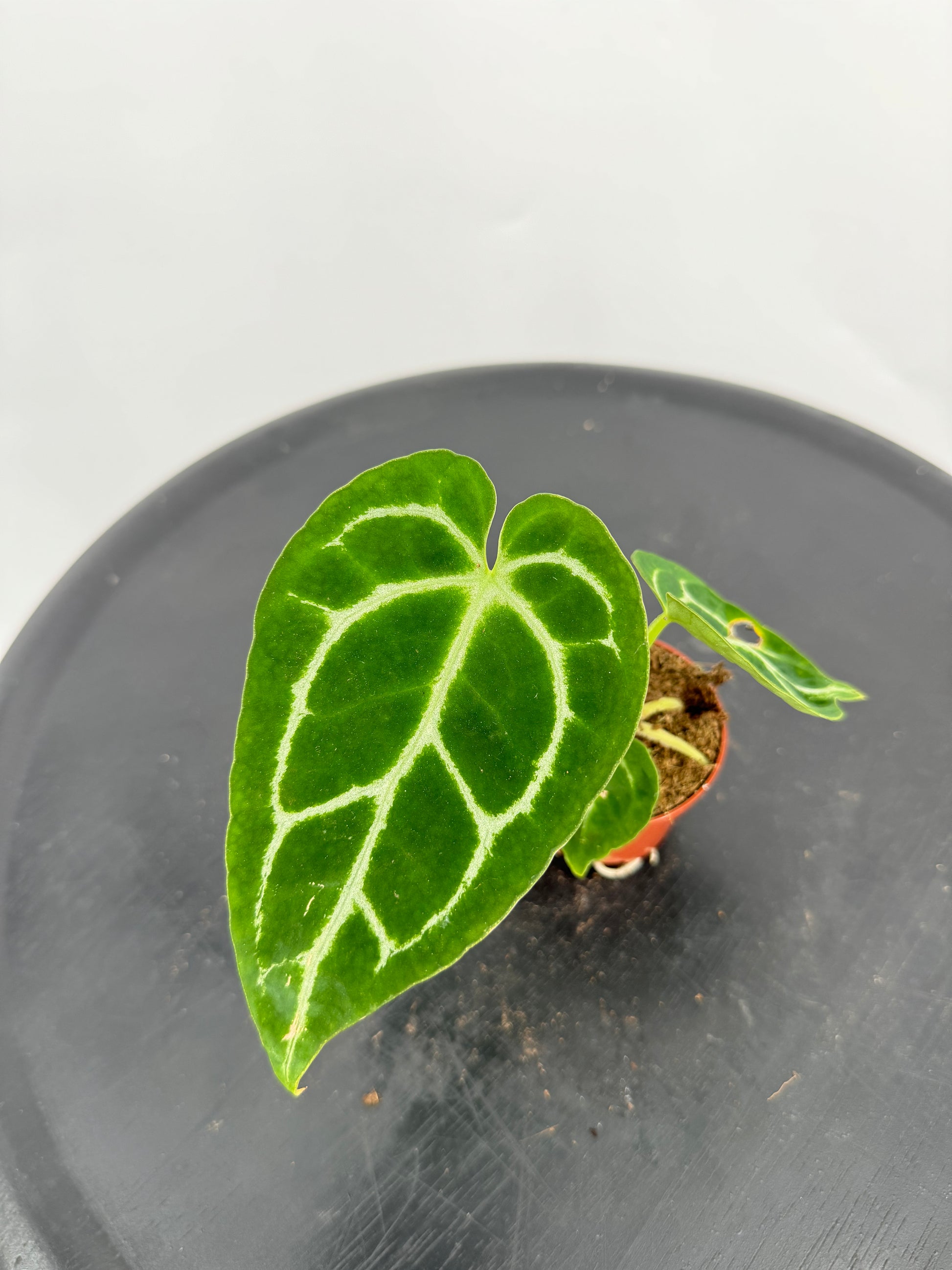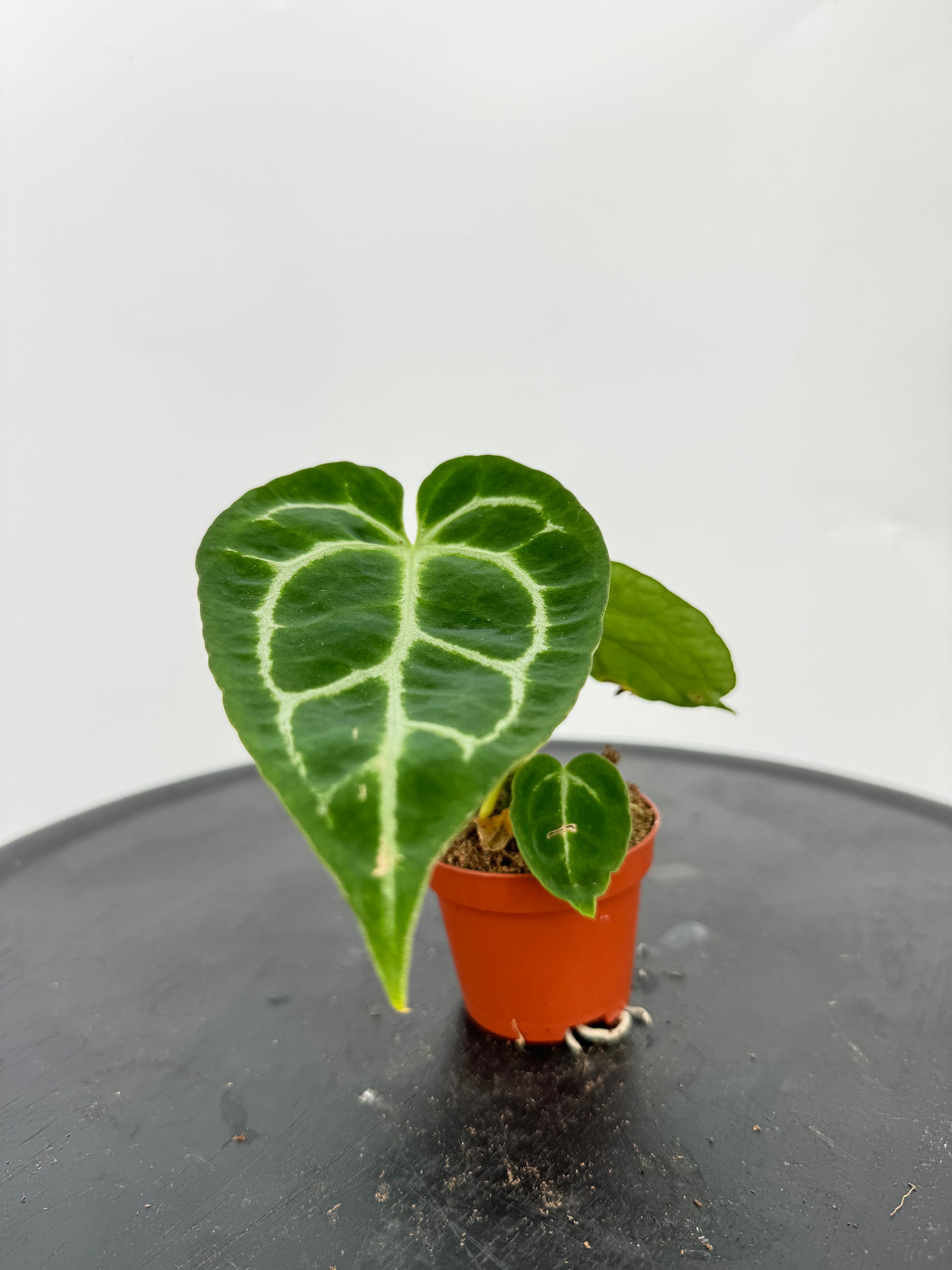 אנטוריום מדהים בקוטר 5 ס"מ עם עלים מבריקים בעלי דפוס עורקים לבנים מרשים. צמח בית יוקרתי זה יוצר נוכחות חזקה עם עלוות טרופית ייחודית ומושלם לאוהבי צמחייה מיוחדת.