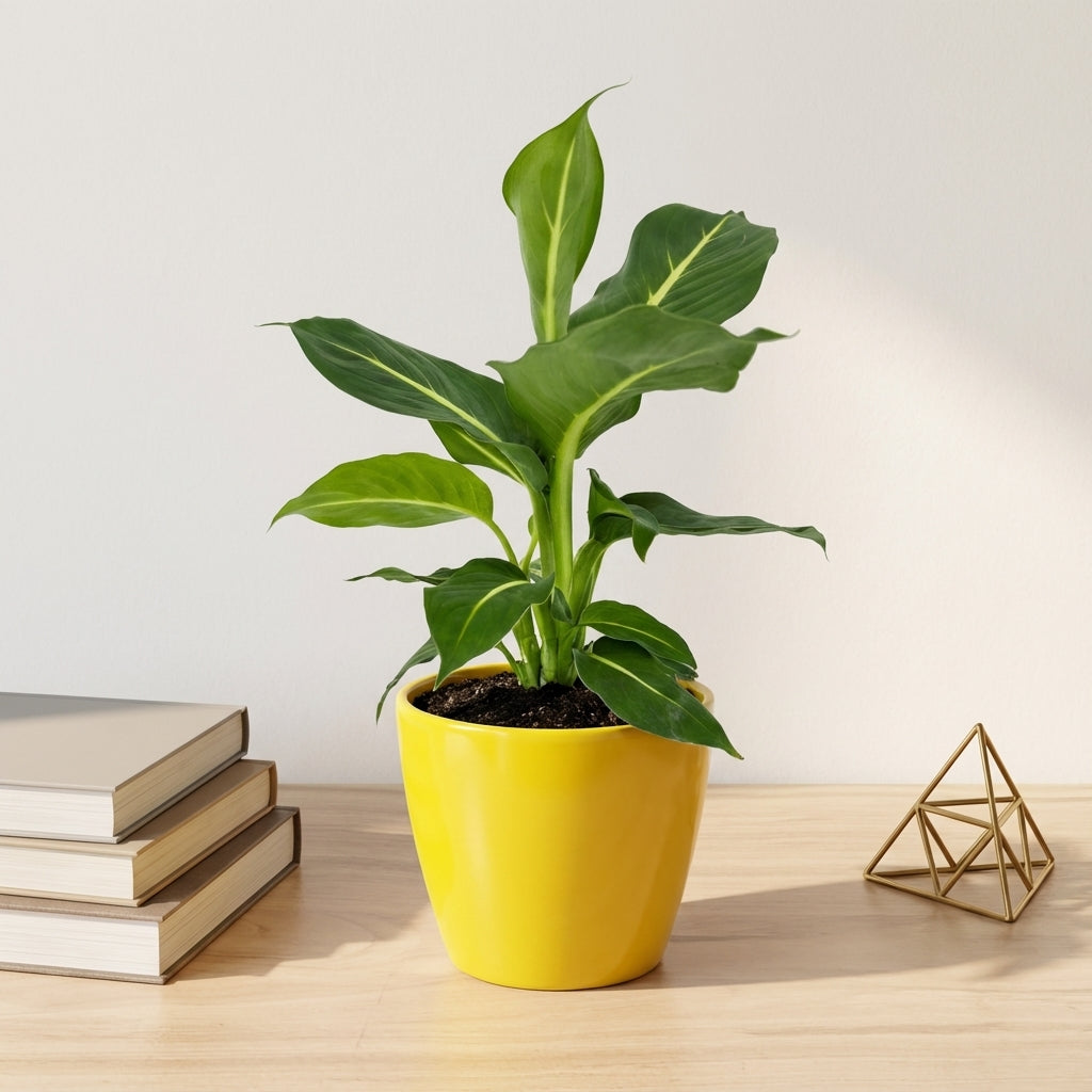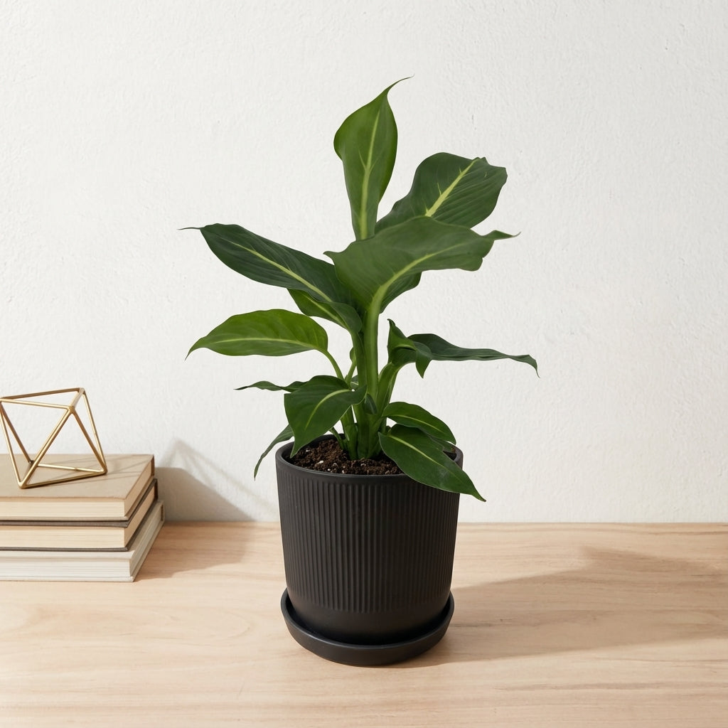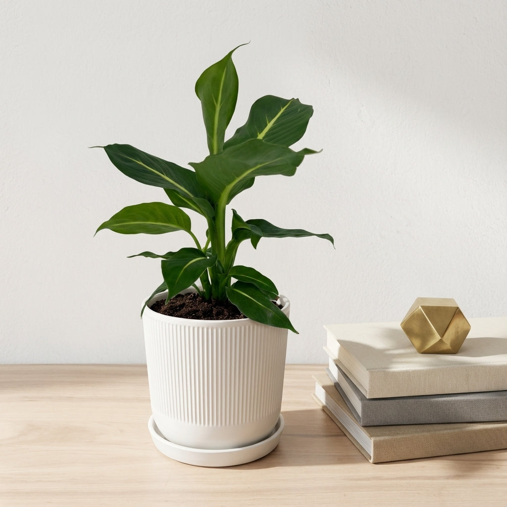 דיפנבכיה קונפקטה היא צמח בית מושלם עם עלים גדולים ומדהימים המעוטרים בדוגמאות לבנות-צהובות על רקע ירוק כהה, מהווה מטהר אוויר טבעי ויעיל המוסיף אלגנטיות וחיוניות לכל פינה בבית.