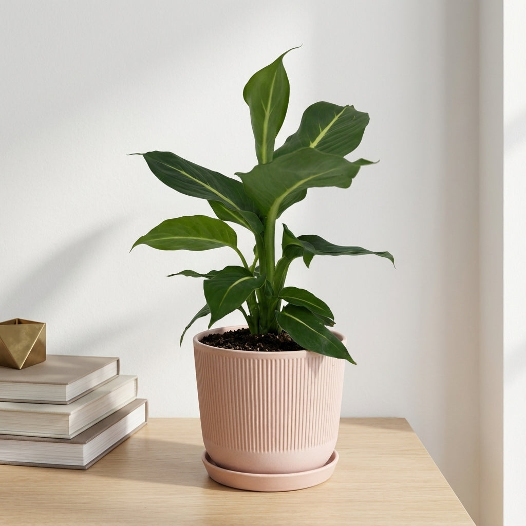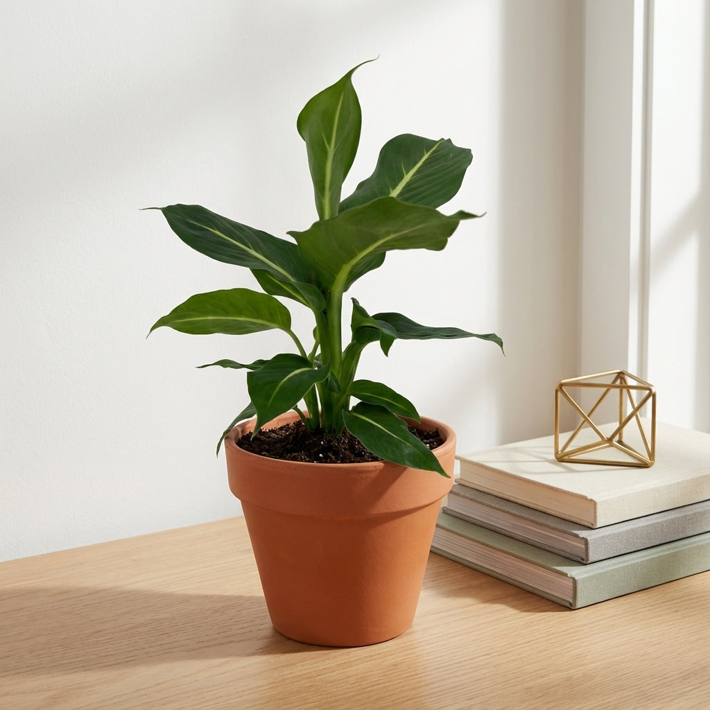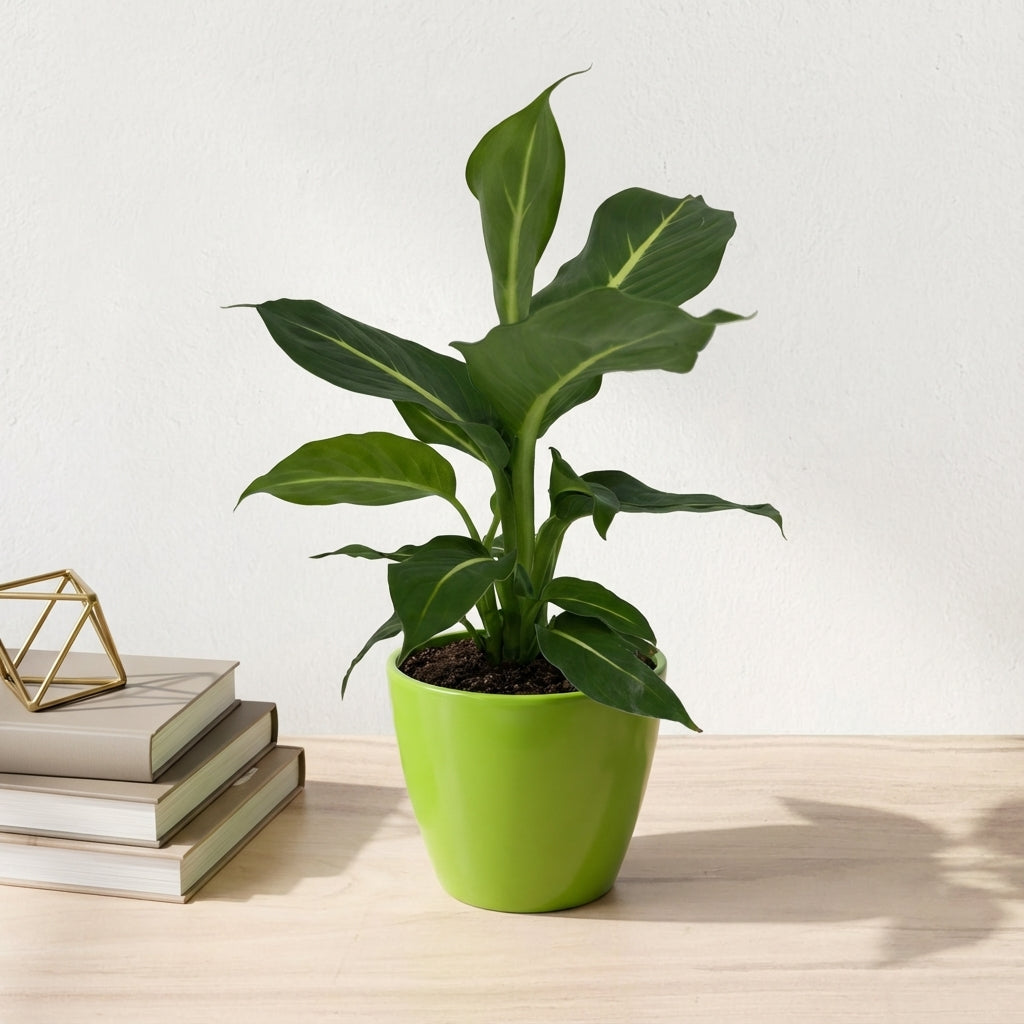 דיפנבכיה קונפקטה היא צמח בית מושלם עם עלים גדולים ומדהימים המעוטרים בדוגמאות לבנות-צהובות על רקע ירוק כהה, מהווה מטהר אוויר טבעי ויעיל המוסיף אלגנטיות וחיוניות לכל פינה בבית.