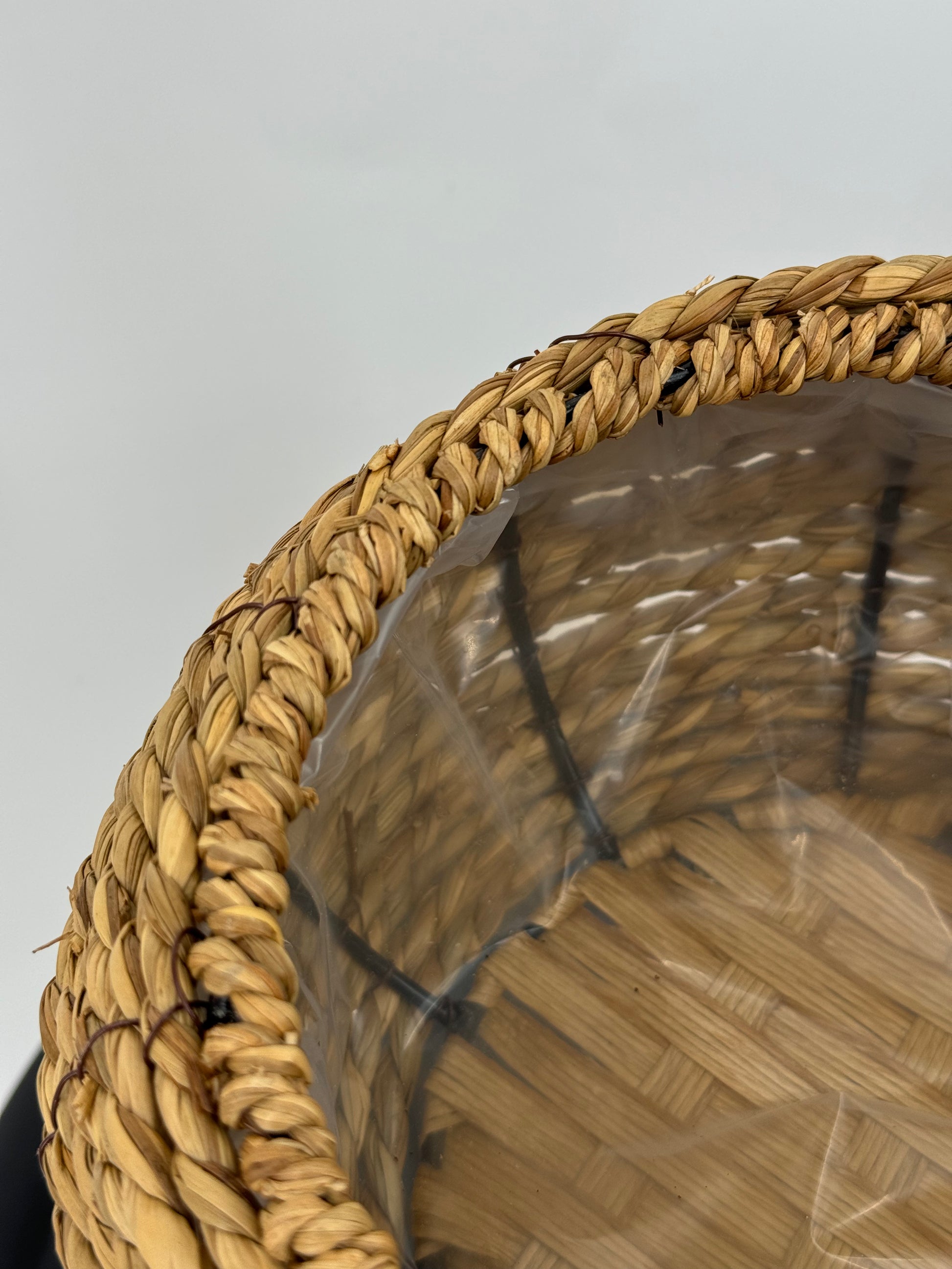 עציץ קש מעוצב בסגנון בוהו עם רגלי עץ טבעי. השילוב המושלם בין חומרי הקש הטבעיים לעץ יוצר מראה חם ומזמין שמתאים לכל סגנון עיצוב.