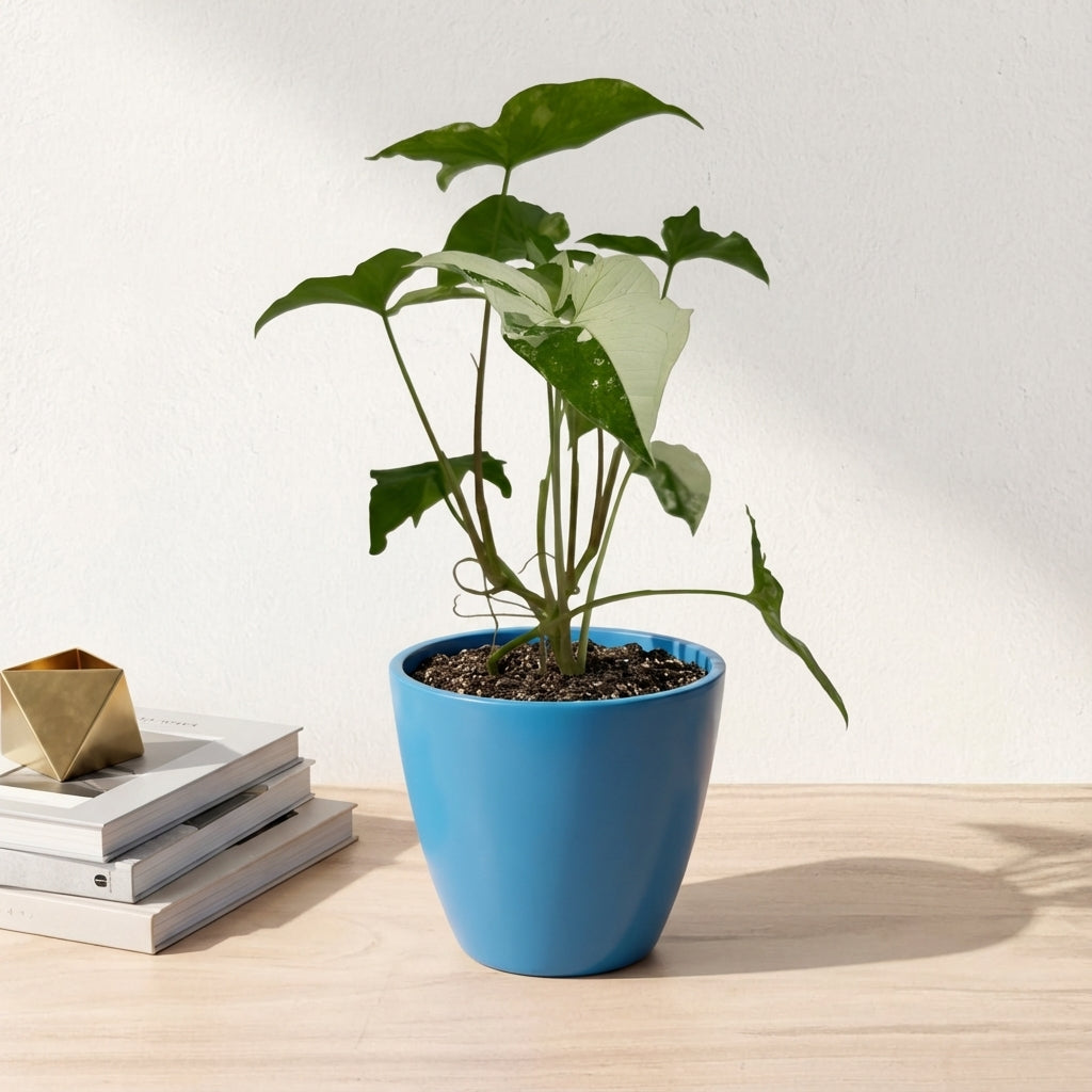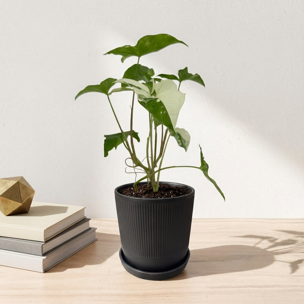 הסינגוניום אלבו מציג עלים מרהיבים בגוונים של ירוק ולבן-קרמי עם תבניות וריגציה יחודיות. זהו צמח נדיר ויוקרתי המוסיף אלגנטיות ויופי טרופי לכל חלל, וידוע בצמיחתו המרשימה ועמידותו.