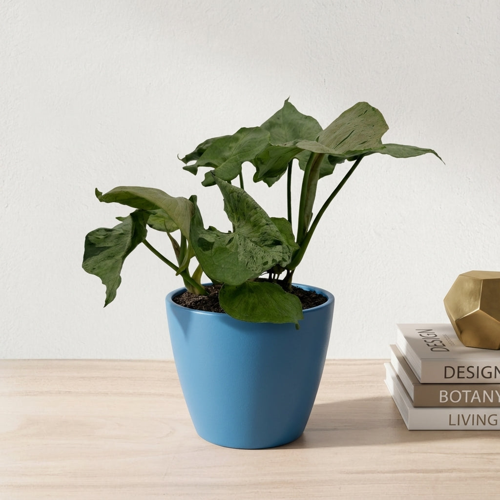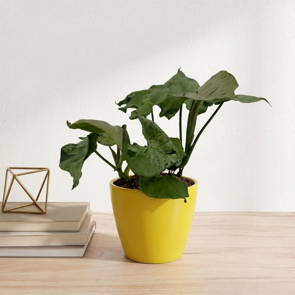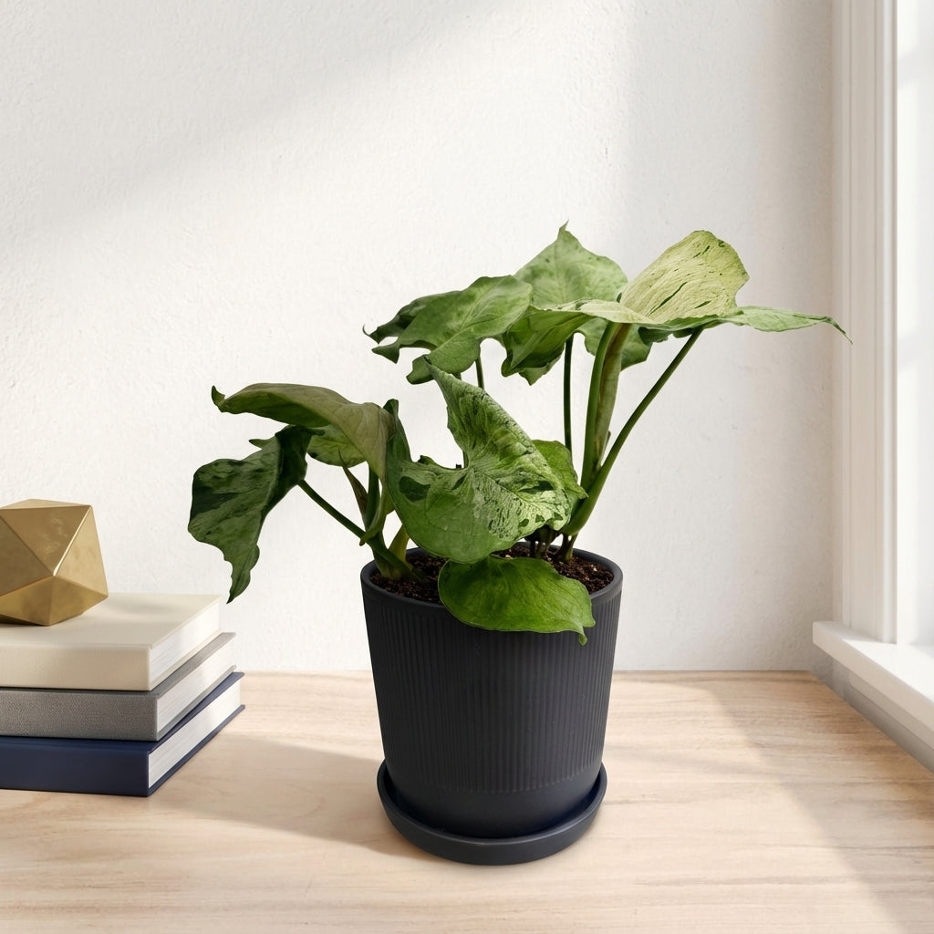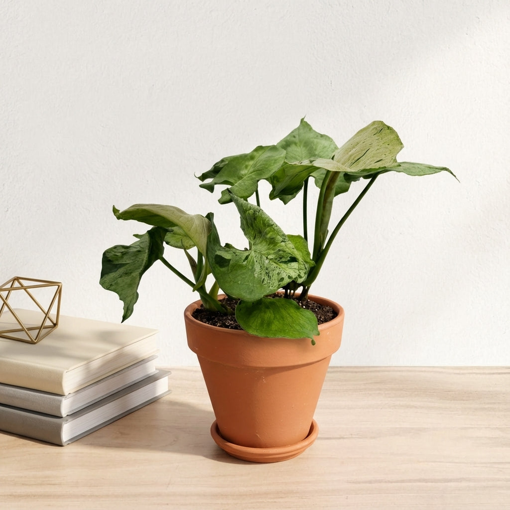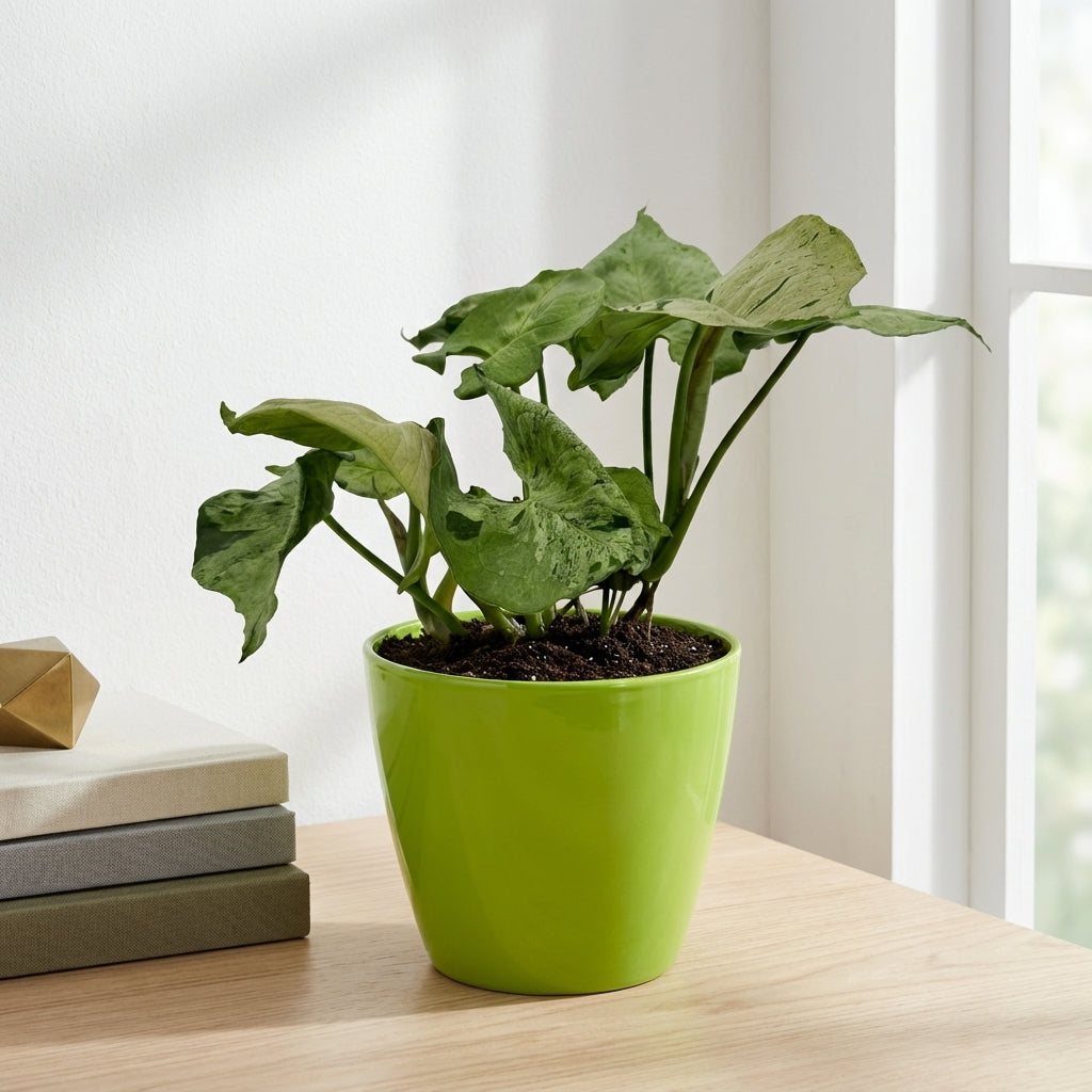 הסינגוניום גריי גוסט מציג עלים ייחודיים בגווני ירוק-אפור עם דוגמת שברירי זכוכית על צמח מטפס אלגנטי, ומהווה בחירה מושלמת לחובבי צמחים נדירים וייחודיים המחפשים להוסיף נופך מיסטי לביתם.
