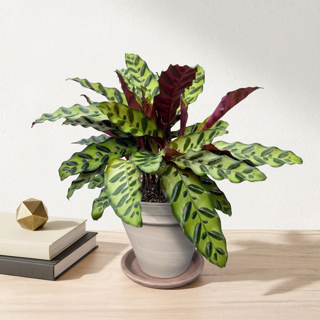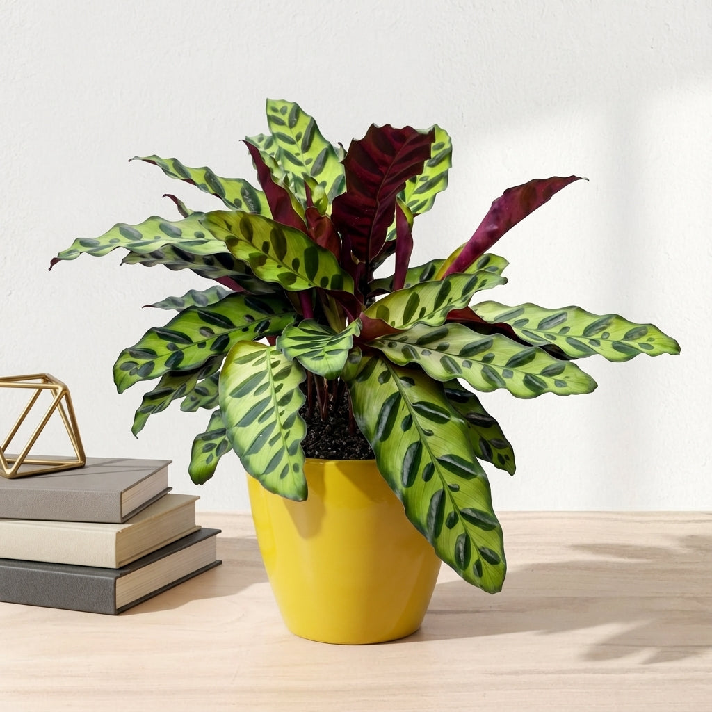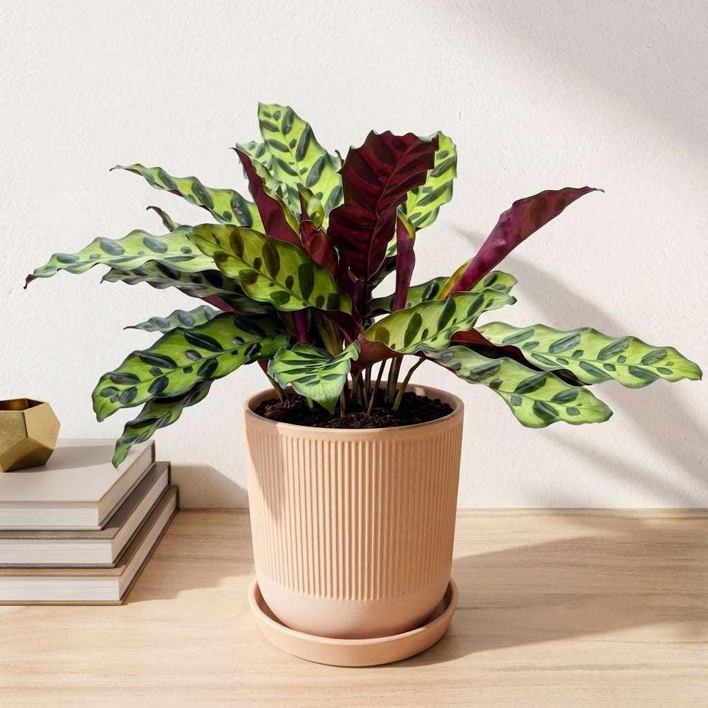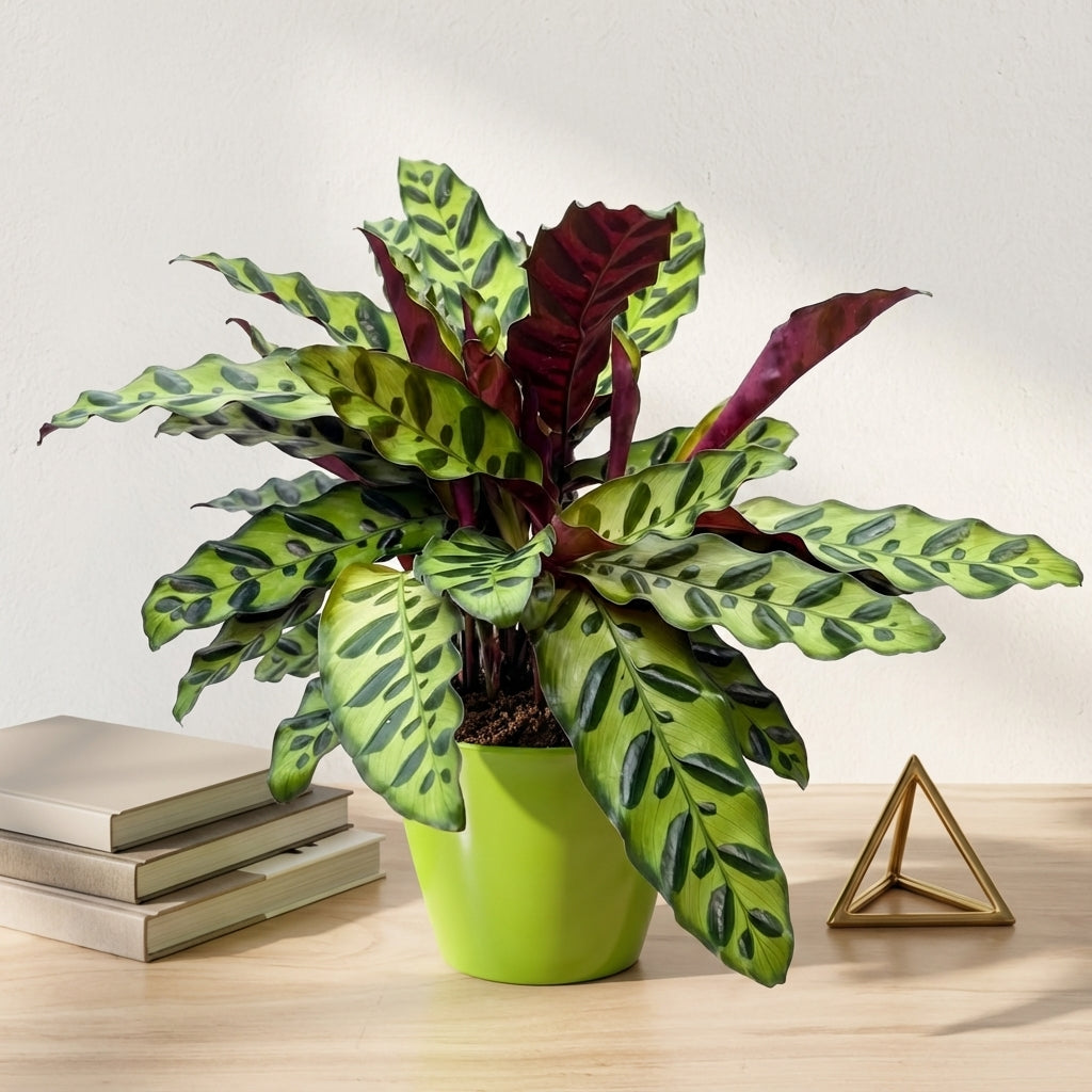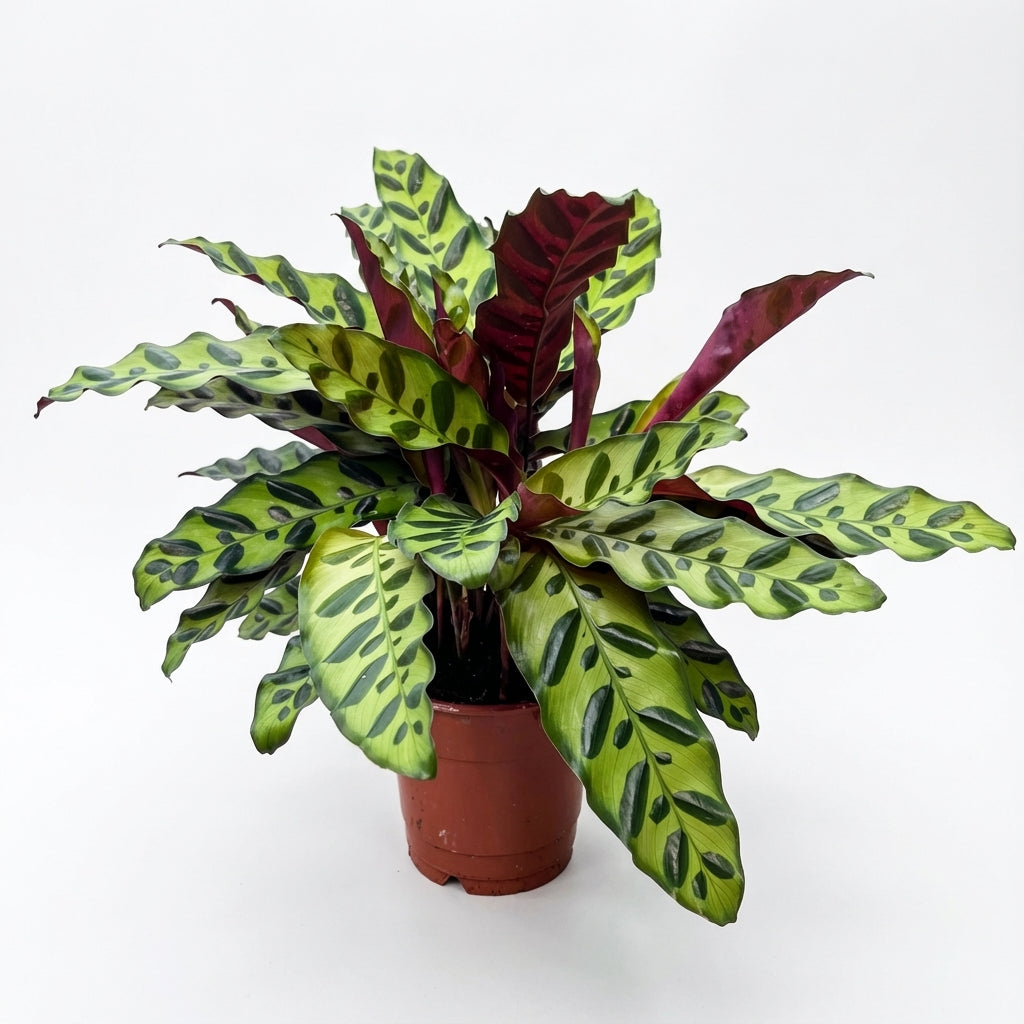 קלתאה אינסיגניס, הידועה גם כ"צמח נחש הגשש" (Rattlesnake Plant), היא צמח נוי טרופי מרהיב עם עלים מוארכים ומחודדים בדוגמת פסים כהים על רקע ירוק-צהוב בהיר. גב העלים בגוון סגלגל-בורגונדי עמוק, מה שמוסיף לה ייחודיות מיוחדת.