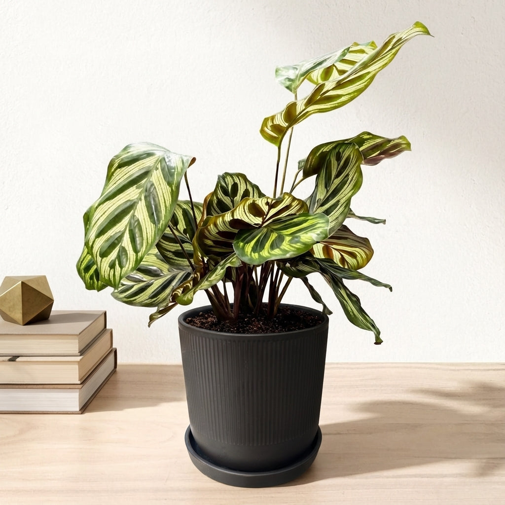 הקלתאה מקויאנה (Calathea Makoyana), המכונה גם "צמח הטווס", היא צמח נוי מרשים בעל עלים דקורטיviים עם דוגמאות ירוקות ייחודיות הנראות כנוצות טווס. העלים מציגים פסים סימטריים בגווני ירוק כהה ובהיר, עם גב סגלגל עדין. צמח זה מושלם להוספת אלגנטיות טרופית לכל פינה בבית.
